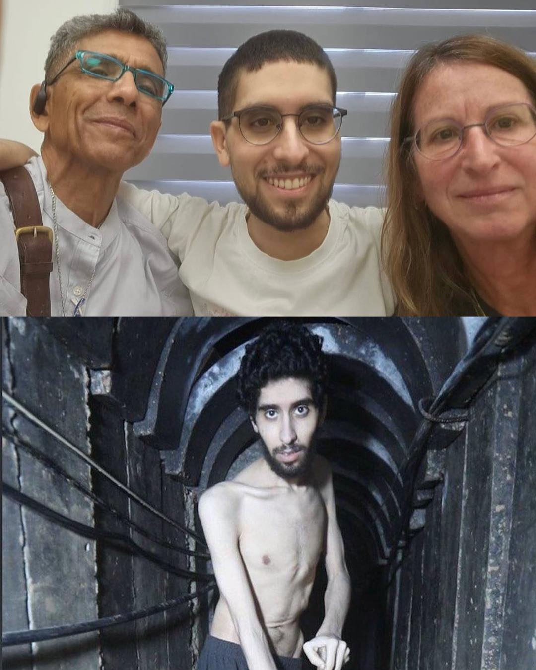 These are photos of Evytar David, one taken during his time as a hostage in Gaza and the other from today, as he reunited with his parents in Israel after 2 years in Hamas captivity. Welcome home